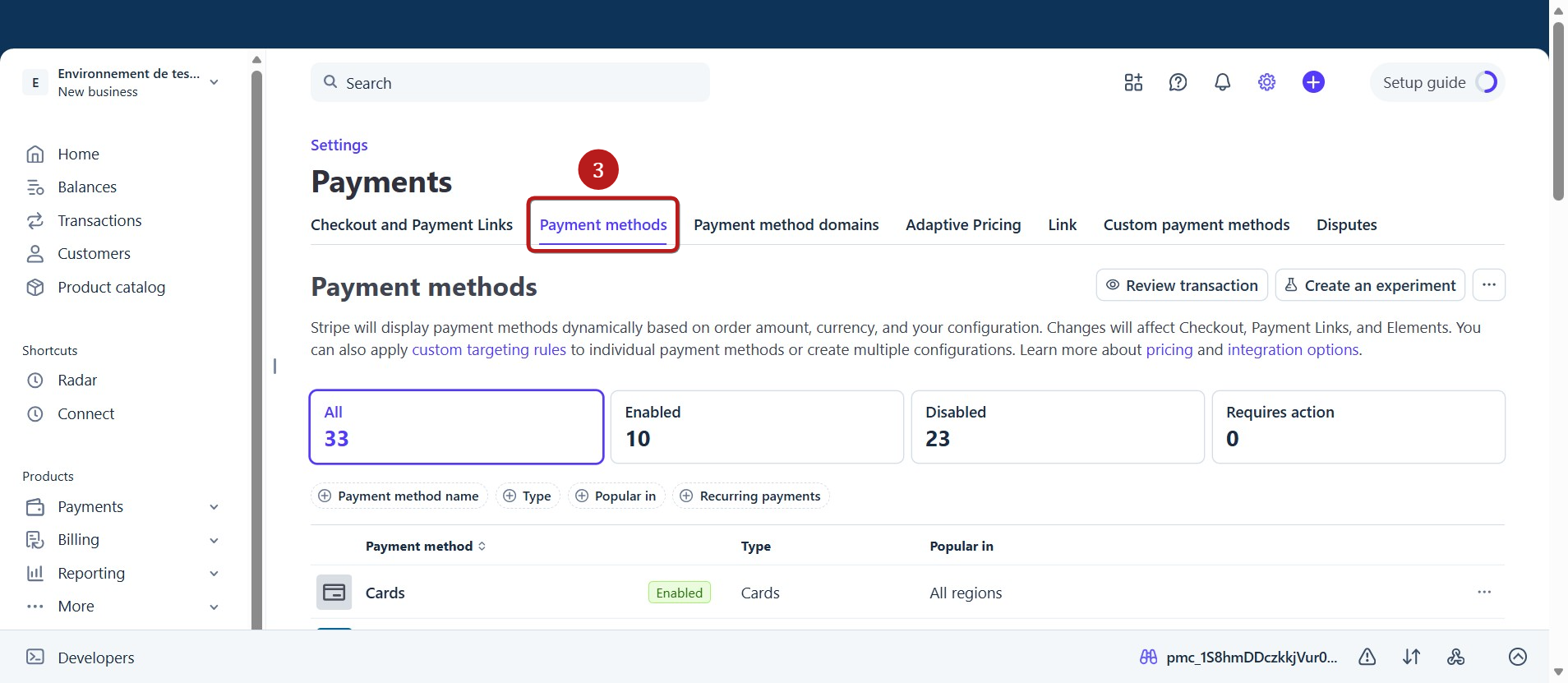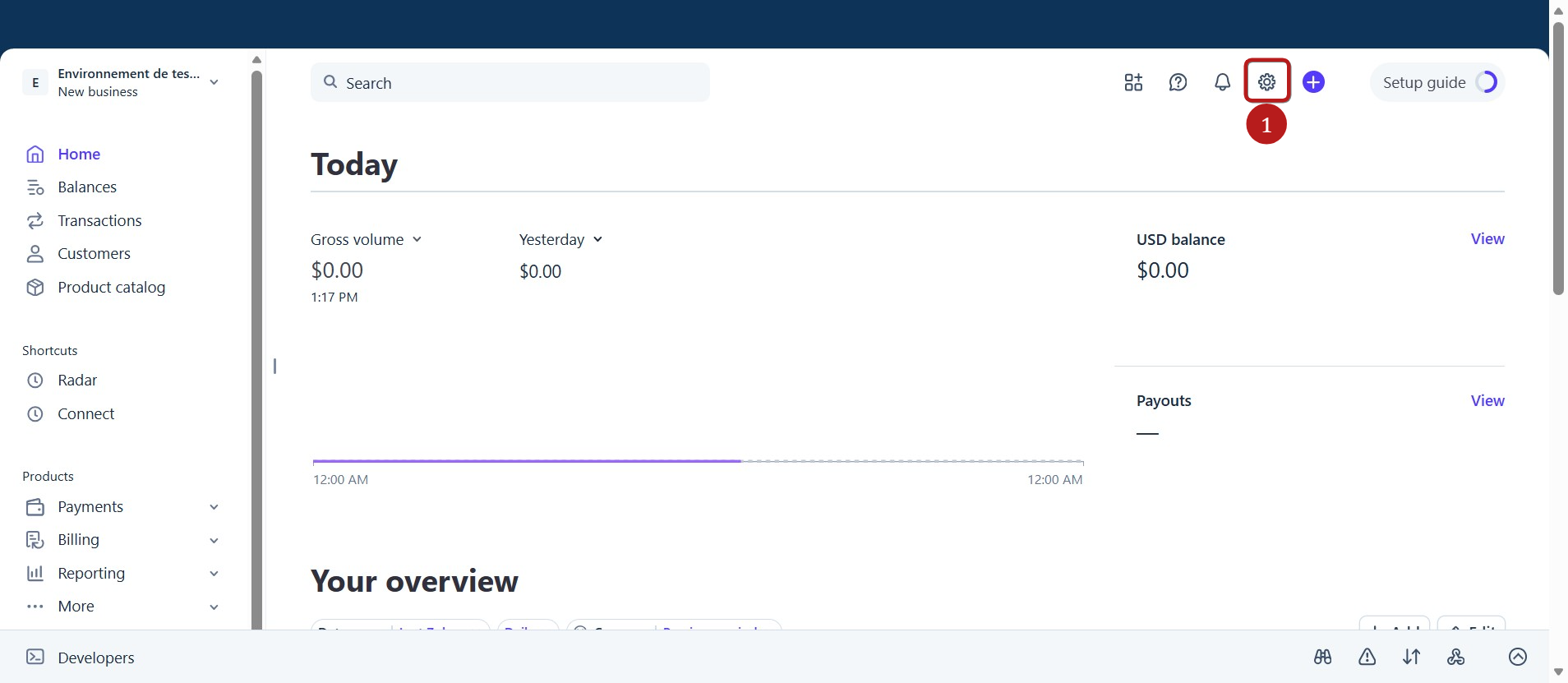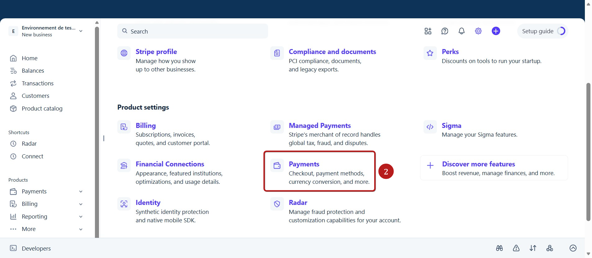 Na hlavnom paneli Stripe kliknite na Nastavenia (1).