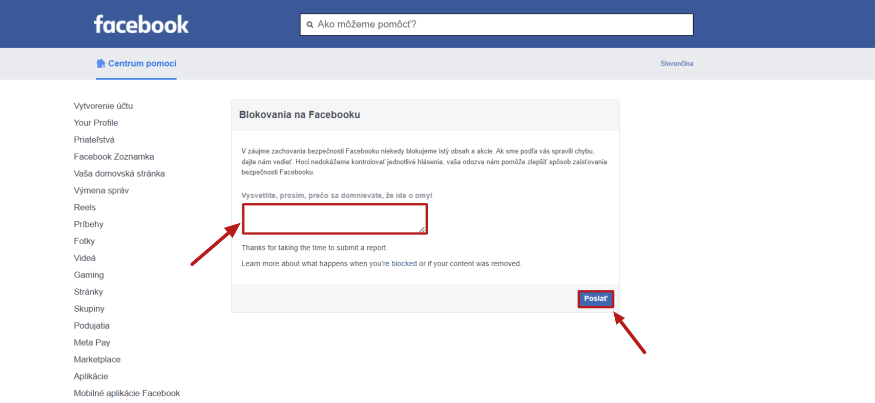 - Vo formulári spätnej väzby, ktorý sa otvorí, zdvorilo vysvetlite, že si nemyslíte, že daný odkaz porušuje štandardy komunity Meta. Uveďte tiež, že doména patrí známej marketingovej platforme s viac ako 900 000 používateľmi a že ide o legitímny odkaz, ktorý chcete zdieľať.