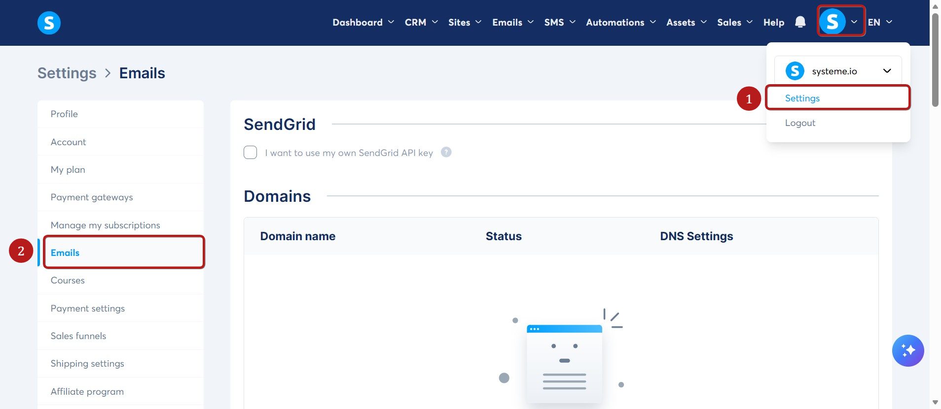 Ak používate vlastný účet SendGrid na odosielanie e-mailov a nepoužívate autoresponder systeme.io, odporúčame kontaktovať podporu SendGrid pre pokyny k overeniu vašej domény s LWS, aby ste zlepšili doručiteľnosť e-mailov.