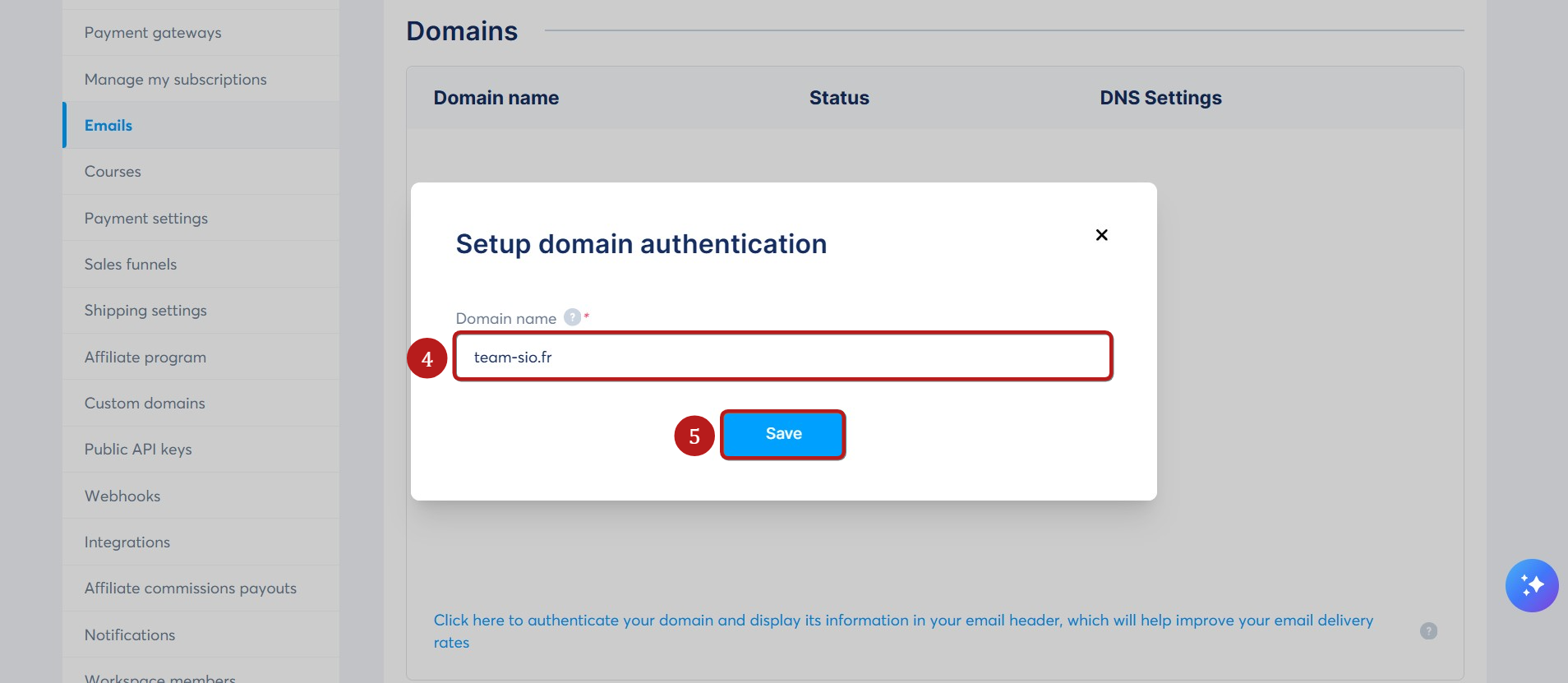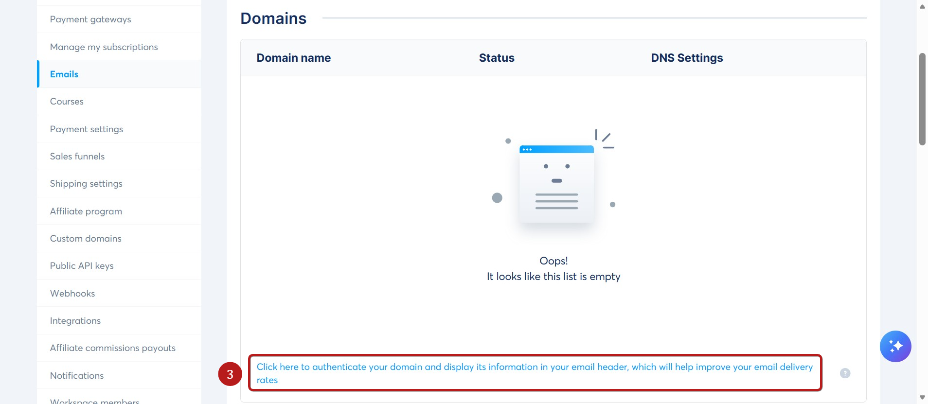 Prejdite do sekcie Domény, potom kliknite na Kliknite sem pre overenie vášho doménového názvu a zobrazenie jeho informácií v hlavičke e-mailu, čo pomôže zlepšiť doručiteľnosť vašich e-mailov (3).