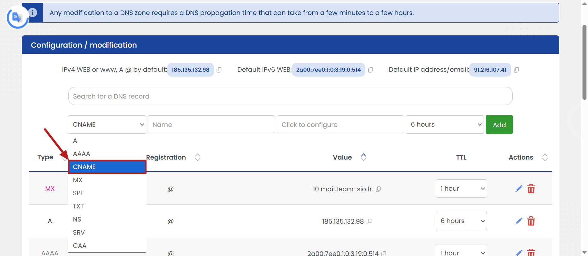 - Vyberte možnosť CNAME na pridanie prvých 3 záznamov.
