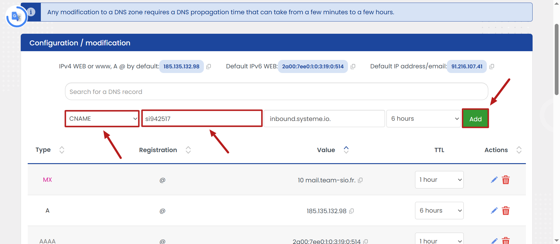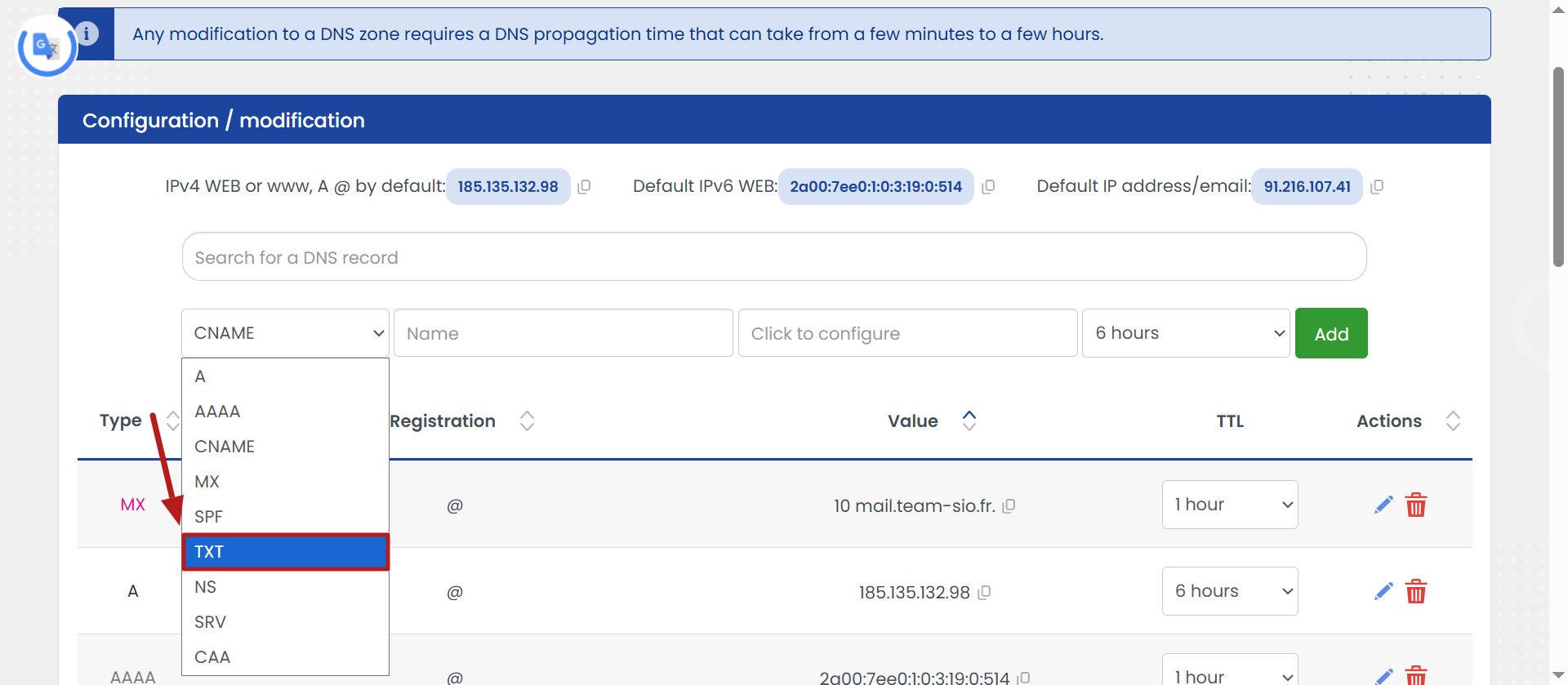- Vráťte sa späť k zoznamu záznamov, aby ste pridali TXT záznam vygenerovaný na vašom účte systeme.io a skopírujte to, čo je zobrazené na obrázku nižšie: